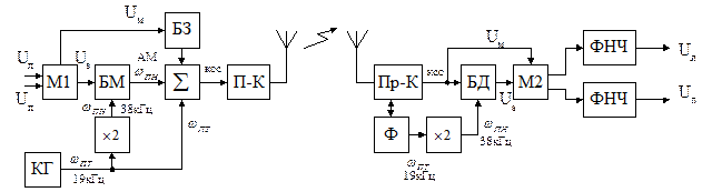 Системы с пилот–тоном применяются в США, Канаде, Японии и европейских странах, включая СНГ. В этой системе КСС (см. рис.1) также содержит тональную часть, представляющую собой сумму сигналов U л и Uп , и надтональную часть, являющуюся результатом амплитудной модуляции поднесущей частоты fпн = 38кГц разностью сигналов Uл-Uп. Однако поднесущая здесь подавлена полностью. Для синхронного и синфазного ее восстановления в приемнике в спектр КСС введен специальный пилот – тон, частота которого fпг = fпн / 2. В спектре КСС пилот – тон располагается между тональной и над тональной частями.
