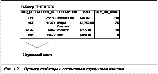 Таблица PRODUCTS, фрагмент которой показан на рис. 1.7, является примером таблицы, в которой первичный ключ представляет собой комбинацию столбцов. Такой первичный ключ называется составным. Столбец MRF_ID содержит идентификаторы производителей всех товаров, перечисленных в таблице, а столбец PRODUCT_ID содержит номера, присвоенные товарам производителями. Может показаться, что столбец PRODUCT_ID мог бы и один выполнять роль первичного ключа, однако ничто не мешает двум различным производителям присвоить своим изделиям одинаковые номера. Таким образом, в качестве первичного ключа таблицы PRODUCTS необходимо использовать комбинацию столбцов MRF_ID и PRODUCT_ID. Для каждого из товаров, содержащихся в таблице, комбинация значений в этих столбцах будет уникальной.