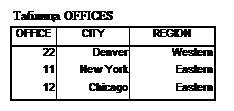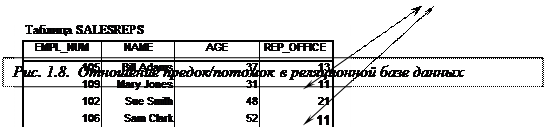 Отношение предок/потомок, существующее между офисами и работающими в них людьми, в реляционной модели не потеряно; просто оно реализовано в виде одинаковых значений данных, хранящихся в двух таблицах, а не в виде явного указателя. Все отношения, существующие между таблицами реляционной базы данных, реализуются в таком виде.
