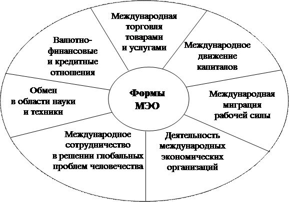 | Система МЭО включает международный обмен товарами, услугами, факторами производства (рабочей силой и капиталом), валютно-финансовую сферу, сферу научно-технического и производственного сотрудничества. МЭО проявляются в разных формах (см. рис. 1.3).