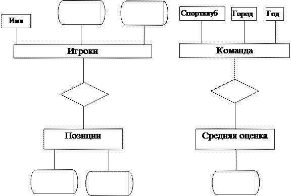 Для спецификации концептуальной модели СУБД предоставляет язык определения данных (ЯОД), являющийся языком высокого уровня и позволяющий описывать концептуальную схему в терминах конкретной логической модели данных, которые используются в системах БД: реляционная, сетевая и иерархическая. Рассмотрим свойства этих моделей на примере БД “Футбол”. На рис.16. представлена диаграмма объектов - связей данной БД, где прямоугольники представляют наборы объектов, овалы - атрибуты, а ромбы - связи.