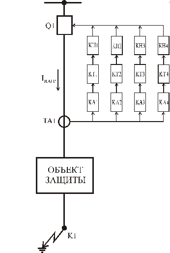 Рассмотрим универсальную структурную схему многоступенчатой защиты на примере токовой, изображенной на рисунке 1.2, где KA1, KA2, KA3 и KA4 – токовые измерительные органы (реле тока); KT1, KT2, KT3 и KT4 – органы задержки (реле времени); KH1, KH2, KH3 и KH4 – индикаторы срабатывания ступеней (указательные реле), TA1– измерительный трансформатор тока; Q1 – выключатель; К1 – точка КЗ в конце защищаемого объекта. В общем случае РЗ имеет четыре ступени, чаще две или три, в зависимости от ответственности защищаемого объекта и чувствительности ступеней защит.