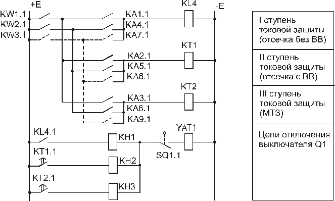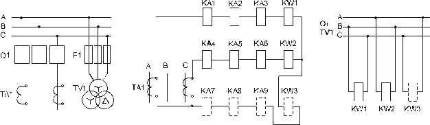 По схеме (рис. 3.8) невозможно различить отсечку с ВВ от МТЗ. Отличие отсечки от МТЗ состоит в способе обеспечения селективности: селективность отсечки обеспечивается зоной действия защиты, а селективность МТЗ обеспечивается выдержкой времени. Для обычных ненаправленных защит в схеме отсутствуют реле направления мощности KW1, KW2 и KW3 и их контакты KW1.1, KW2.1 и KW3.1.