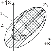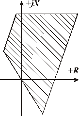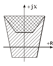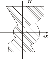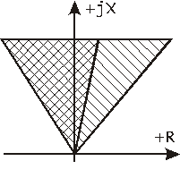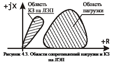 . Обычно jЛЭП = 45…78° и зависит от сечения провода, класса напряжения, т.е. расстояния между проводами. В то же время надо помнить, что желаемый cos jНАГР = 0,7…1,0, при этом jНАГР = 45…0°. В связи с вышесказанным можно нарисовать на комплексной плоскости сопротивления область (рис. 4.3), при попадании в которую защита должна срабатывать (область КЗ на ЛЭП) или не должна срабатывать (область нагрузки).