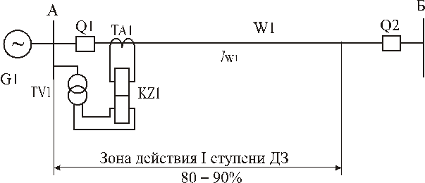 Зона, защищаемая дистанционной защитой, составляет 80…90% от всей длины линии W1 (рис. 4.5).