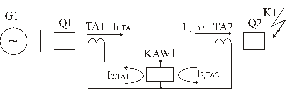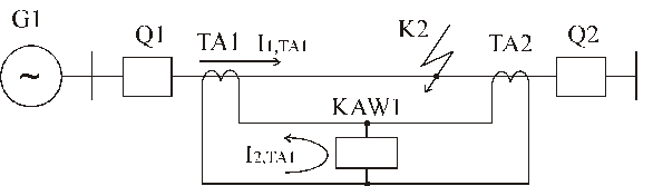 При КЗ в зоне действия защиты (рис. 5.5), в точке К2, ток I1,TA1 к повреждению протекает через трансформатор тока ТА1 от системы G1 (в худшем случае).