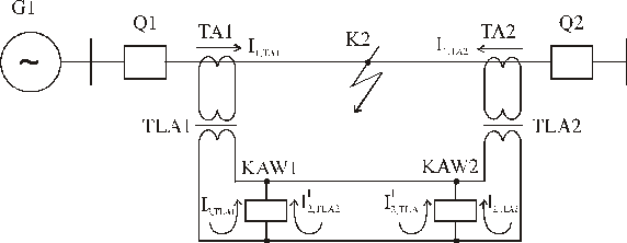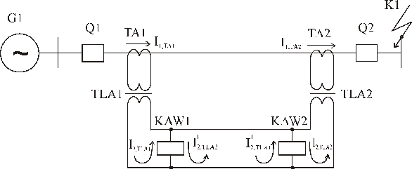 В этом случае через реле KAW1 и KAW2 протекают суммы токов от трансформаторов TLA1 и TLA2: