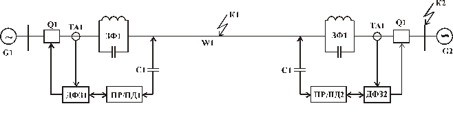 Рисунок 5.9. Продольная дифференциально-фазная высокочастотная защита: ДФЗ1 и ДФЗ2 ― первый и второй полукомплекты дифференциально-фазной высокочастотной защиты; ЗФ1 и ЗФ2 ― заградительные фильтры; С1 и С2 ― конденсаторы связи; ПР/ПД1 и ПР/ПД2 ― приемник передатчик; TА1 и TА2 ― трансформаторы тока.
