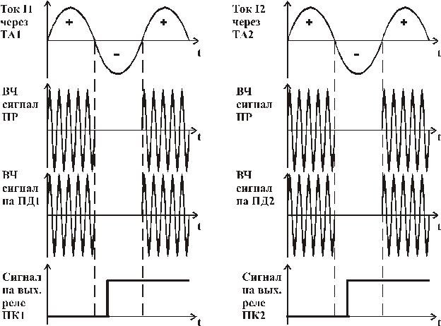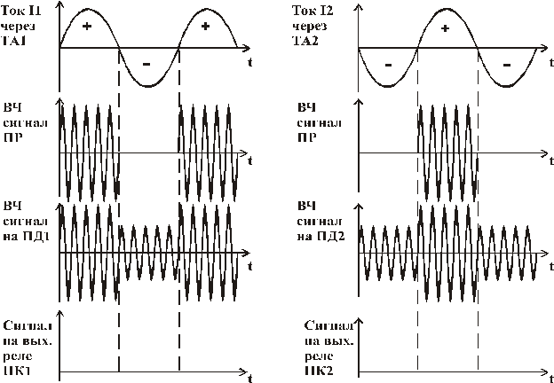 В режиме внешнего КЗ (точка К2) ток протекает от источника G1 к месту повреждения. За положительное направление принимается направление от шин в линию, поэтому через ТА1 ток будет иметь положительное направление, а через ТА2 ― отрицательное. При положительной полуволне тока каждый полукомплект формирует высокочастотный (ВЧ) сигнал (рис. 5.10), с частотой модуляции 10―500 кГц. Так как направления токов различны, положительные полуволны в один и тот же момент времени не совпадают. Высокочастотный сигнал передается в ЛЭП через конденсатор связи С1 (С2). С противоположной стороны сигнал поступает в приемник с незначительно уменьшенной амплитудой, так как ВЧ - сигнал по мере прохождения по ЛЭП затухает. Приемник каждого полукомплекта принимает свой ВЧ - сигнал и сигнал от другого полукомплекта. Оба сигнала складываются, и в результате присутствует непрерывный ВЧ - сигнал. Выходное реле в этом случае не срабатывает (рис. 5.10).
