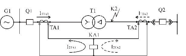 При внешнем КЗ в точке К1 токи протекают к месту повреждения, а вторичные токи трансформаторов тока в реле вычитаются, и результирующий ток равен:
