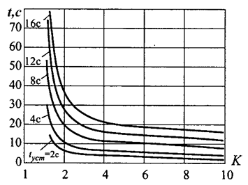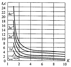 Рисунок Б3. Характеристики зависимости времени срабатывания t от кратности тока срабатывания К для реле: