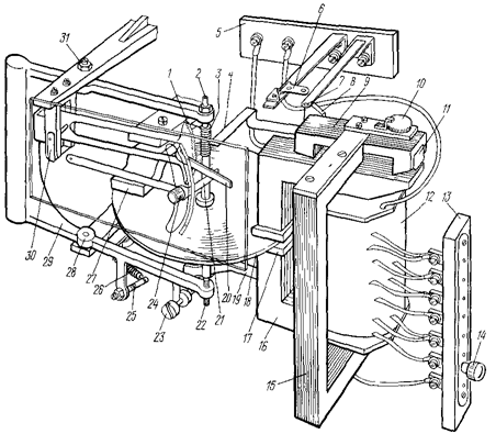 1 ― зубчатый сектор; 2 ― верхняя опора диска; 3 ― червяк; 4 ― фигурный рычаг; 5 ― контактная колодка; 6 ― неподвижный контакт; 7 ― подвижный контакт; 8 ― текстолитовая пластина; 9 ― якорь отсечки; 10 ― регулировочный винт отсечки; 11 ― короткозамкнутый виток электромагнитной части; 12 ― катушка; 13 ― штепсельный мостик; 14 ― штепсельный винт; 15 ― шунт магнитопровода; 16 ― магнитопровод; 17 ― короткозамкнутые витки индукционной части; 18 ― алюминиевый диск; 19 ― скоба; 20 ― толкатель; 21 ― упор; 22 ― нижняя опора диска; 23 ― упорный винт: 24 ― фасонный винт; 25 ― регулировочный винт пружины; 26 ― пружина; 27 ― постоянный магнит; 28 ― нижняя опора рамки; 29 ― рамка; 30 ― полуось сектора; 31 ― верхняя опора рамки.