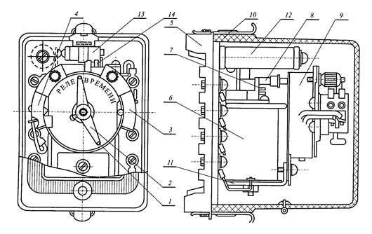Рисунок Б10. Общий вид реле РВ-100: 1 ― мостик подвижного контакта; 2 ― траверса; 3 ― колодка неподвижного основного контакта; 4 ― колодка неподвижного временно замыкающего контакта; 5 ― цоколь; 6 ― обмотка; 7 ― якорь; 8 ― заводной рычаг часового механизма; 9 ―часовой механизм; 10 ― кожух; 11 ― магнитопровод; 12 ― добавочный резистор; 13 ― конденсатор; 14 ― толкатель контактов мгновенного действия