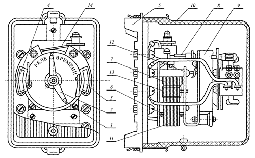 Рисунок Б11. Общий вид реле РВ-100: 1 ― мостик неподвижного контакта; 2 ― траверса; 3 ― колодка неподвижного временно замыкающего контакта; 4 ― колодка неподвижного основного контакта; 5 ― цоколь; 6 ― обмотка; 7 ― якорь; 8 ― заводной рычаг часового механизма; 9 ― часовой механизм; 10 ― кожух; 11 ― магнитопровод; 12 ― стягивающая рамка; 13 ― короткозамкнутый виток; 14 ― толкатель контактов мгновенного действия.