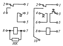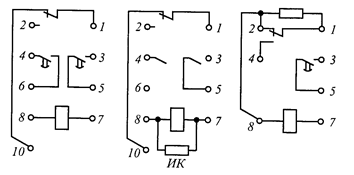 Рисунок Б12. Схемы реле: а) РВ-112…РВ-142 на 24, 48 В и РВ-218…РВ-248; б) РВ-112…РВ-142 на 110, 220 В; в) РВ-113…РВ143; г) РВ-114…РВ-144 на 24, 48 В и РВ‑217...РВ‑247; д) РВ-114…РВ-144 на 110, 220 В и РВ-215…РВ-245;
