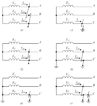 Большинство повреждений в электрических системах приводит к КЗ фаз между собой или на землю (рис. 1.3). В обмотках электрических машин и трансформаторов, кроме КЗ бывают также замыкания между витками одной фазы.