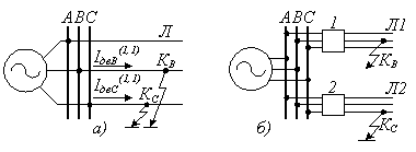 . На рис. 1.11, б показаны линии Л1 и Л2, отходящие от шин подстанции, на одной из которых произошло замыкание фазы В в т. К В, а на другой – фазы С в т. К С – К дв(1,1). Если при этом защита отключит Л2, то на Л1 останется однофазное замыкание на землю К з(1), не являющееся КЗ. Поэтому целесообразно отключать лишь одно место повреждения при К дв(1,1), а оставшееся К з(1) может быть ликвидировано ремонтным персоналом при получении сигнала о нем.