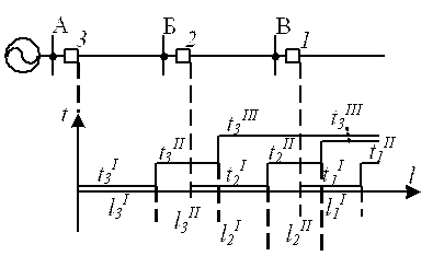 На рис. 1.19 приведены трехступенчатые характеристики выдержек времени защит, включенных на радиальные линии сети с односторонним питанием. Каждый комплект защиты (1, 2, 3) имеет три ступени, характеризуемые выдержками времени t I, t II, t III и защищаемыми зонами l I, l II и l III, определенными при металлических КЗ.