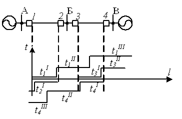 Рис. 1.19. Ступенчатые характеристики выдержек времени защит с относительной селективностью и сетей с односторонним питанием