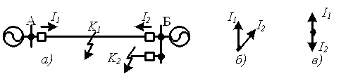 На рис. 1.21, а показана линия с двусторонним питанием, оборудованная защитой с абсолютной селективностью. Условные положительные направления токов I I и I II с двух ее сторон, показанные на схеме стрелками, приняты от шин А и Б в сторону линии. При КЗ на защищаемой линии (т. К 1) токи КЗ I I и I II сдвинуты по фазе на относительно небольшой угол d (рис. 1.21. б), определяемый углом сдвига ЭДС Е А и Е Б и неодинаковыми углами сопротивлений arctg (X A/ R A) и arctg (X Б/ R Б) двух частей системы по отношению к т. К 1. В случаях внешних КЗ этот угол для участков не очень большой длины, если пренебречь их емкостной проводимостью, равен 180° (рис. 1.21, в). Мощности КЗ при повреждении на линии и тех же условных направлениях, что и токи, имеют одинаковые знаки, а в случаях внешних КЗ – разные.