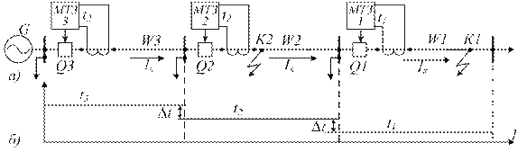При КЗ в какой-либо точке сети, например в т. К1 (рис. 2.2, а), ток КЗ I к проходит по всем участкам сети, расположенным между источником питания и местом повреждения, в результате чего приходят в действие все устройства РЗ (1, 2, 3). Однако по условию селективности сработать на отключение должна только РЗ МТЗ 1, установленная по поврежденной ЛЭП. Для обеспечения указанной селективности МТЗ выполняются с выдержками времени, нарастающими от потребителей к источнику питания (рис. 2.2, б). При соблюдении этого принципа в случае КЗ в т. К1 раньше других сработает защита МТЗ 1 и отключит поврежденную ЛЭП. Защиты МТЗ 2, МТЗ 3, имеющие большую выдержку времени, вернутся в начальное положение, не успев подействовать на отключение. Соответственно при КЗ в т. К2 быстрее всех сработает МТЗ 2, а МТЗ 3, имеющая большее время отключения, не успеет подействовать.