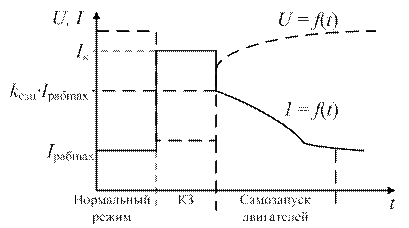 Характер изменения тока и напряжения при КЗ в сети и после его отключения с учетом режима самозапуска электродвигателей представлен на рис. 2.7.