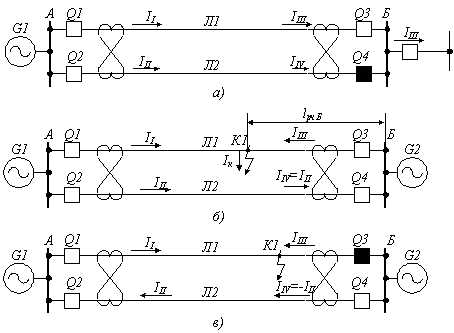 Контакты реле KW1 и KW2, подготавливающие цепи на отключение выключателя Q1, замыкаются в следующих режимах: токи I I и I II совпадают с условными положительными направлениями и