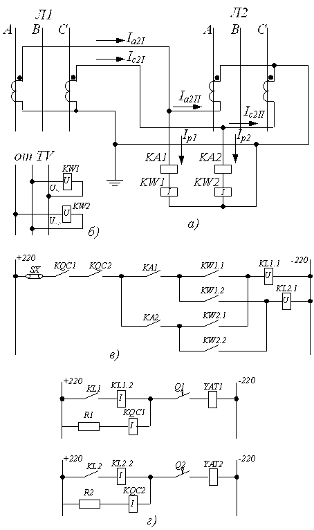 При КЗ на линии Л1, например между фазами А и В, срабатывают реле KA1 и KW1 (рис. 6.15, а). При этом замыкаются контакты КА1 и KW1.1, что приводит к срабатыванию реле KL1 – обтекается током его рабочая обмотка KL1.1 (рис. 6.15, в). При замыкании его контакта KL1 подается напряжение на электромагнит отключения YAT1, отключается выключатель Q1 и возвращается реле KQC1. Удерживающая обмотка KL1.2 реле KL1 исключает срыв отключающего воздействия при возможной вибрации контактов реле KW1 или KW2.