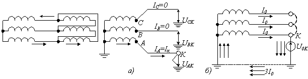 Рис. 7.1. Однофазное КЗ в сети (а) и прохождение токов I0 под действием U0к (б)