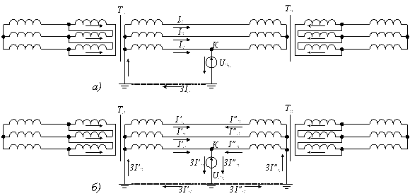 Рис. 7.2. Распределение токов нулевой последовательности при однофазном КЗ: а – при заземлении нейтрали с одной стороны линии; б – при заземленных нейтралях с обеих сторон линии