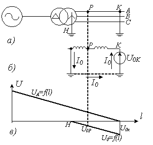 Источником появления токов нулевой последовательности можно считать напряжение U 0к, появляющееся на каждой фазе в месте КЗ. Под влиянием этого напряжения в каждой фазе возникают токи I 0. Они замыкаются по контуру фаза-земля через место повреждения и заземленные нейтрали.