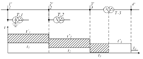 Рис. 7.5. Ступенчатый принцип выбора выдержек времени максимальной токовой защиты нулевой последовательности: 1', 2', 3', 4' – максимальные токовые защиты;