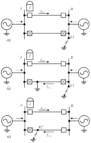 Имея это ввиду, максимальное значение тока I 0 в параллельных линиях при внешних КЗ определяют из рассмотрения трех расчетных схем (рис. 7.12, а, б, в).