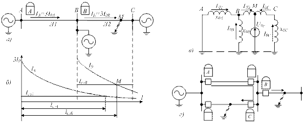 На рис. 7.13 показан графический способ определения величины I 0расч для отсечки А. Он сводится к следующему. Строятся кривые I А и I В (рис. 7.13, б) изменения тока 3 I 0, проходящего в реле отсечек А и В при КЗ в разных точках линии Л2. По точке пересечения кривой I В с прямой I с.зВ находится граница (т. М) зоны действия мгновенной отсечки В, установленной на Л2.