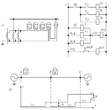 Схема и характеристика такой трехступенчатой направленной защиты показаны на рис. 7.14, а, б.