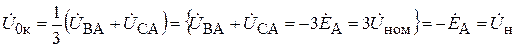 При металлическом замыкании на землю одной фазы, например А, ее напряжение относительно земли снижается до нуля (U А=0), т.к. в результате соединения с землей т. К приобретает потенциал, равный нулю (потенциал земли).