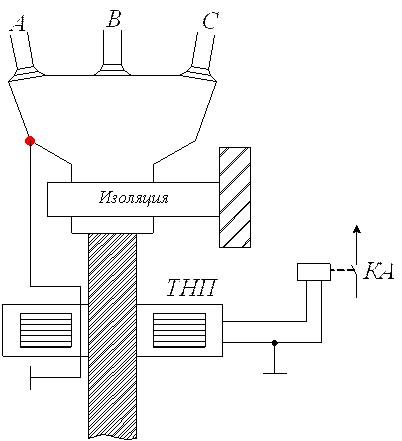 Для выполнения защиты в качестве фильтра тока нулевой последовательности используется трансформатор тока нулевой последовательности (ТТНП) (рис. 7.19). При замыкании в сети на землю токи повреждения могут замыкаться как через землю, так и по проводящей оболочке кабеля, в том числе и неповрежденного, что может вызвать неправильное действие защиты. Поэтому кабель на участке от ТТНП до воронки изолируют от земли, а заземляющий провод присоединяют к воронке кабеля и пропускают через отверстие магнитопровода ТТНП в направлении кабеля. При таком исполнении цепей защиты токи, проходящие по броне и проводящей оболочке кабеля, компенсируются токами, возвращающимися по заземляющему проводу.