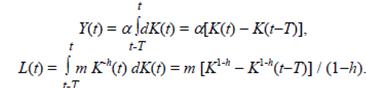 K (t − T) = [ K 1- h (t) – (1 – h)· L (t)/ m ]1/(1- h), и подставим полученное выражение в формулу для расчета Y (t), получим Y (t) = αK (t){1 – [1 – (1 – h)· L (t)/(m · K 1- h (t))]1/1- h }.