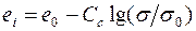 В соответствии с (2.12) при первичном сжатии изменение коэффициента пористости грунта прямо пропорционально изменению напряжений и обратно пропорционально суммарному напряжению. Эту зависимость применяют при рассмотрении деформации очень слабых грунтов, либо при изменении напряжений в значительных пределах.