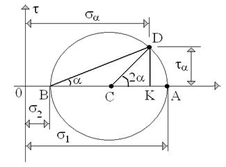 Любая точка на окружности соответствует площадке, наклоненной к главной площадке под углом a и имеющей напряжения
