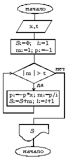 Вычисление сумм - типичная циклическая задача. Особенностью же нашей конкретной задачи является то, что число слагаемых (а, следовательно, и число повторений тела цикла) заранее неизвестно. Поэтому выполнение цикла должно завершиться в момент достижения требуемой точности.