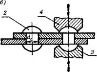 Клепку производят на клепальных машинах (прессах) или вручную (пневматическими молотками). Сначала происходит осадка стержня, зазор между заклепкой и отверстием заполняется, после чего образуется замыкающая головка (рисунок 3.1, б).