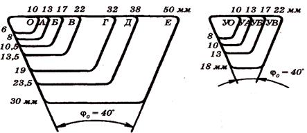 (узкие ремни). Размеры поперечного сечения (обозначаются О, А, Б, В, Г, Д, Е по мере увеличения площади, рисунок 8.3, а) и длина нормальных ремней определены ГОСТ 12841-80.