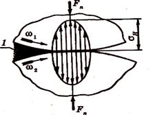 Рисунок 10.4 – Эпюра контактных напряжений (1 – масляный клин)
