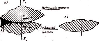 вызывают в месте соприкосновения катков высокие контактные напряжения (рисунок 10.4), которые при работе меняются по отнулевому циклу, вследствие перемещения места контакта по периметру. Циклическое действие контактных напряжений способствует развитию усталостных микротрещин на рабочих поверхностях. При движении с трением в поверхностном слое катка образуются наклонные микротрещины, в результате пластического течения металла (рис. 10.5, а),в которые попадает масло и расклинивает их. Это со временем приводит к выкрашиванию частиц металла (рис. 10.5, б). На рабочей поверхности катка появляются мелкие раковины. Поэтому проектный расчет фрикционных передач выполняют на контактную прочность. При этом повышение твердости поверхностного слоя катков обеспечивает более высокие допускаемые контактные напряжения.
