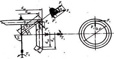 Геометрические параметры. Аналогами делительных днаметров цилиндрических передач в конических являются делительные конусы с углами