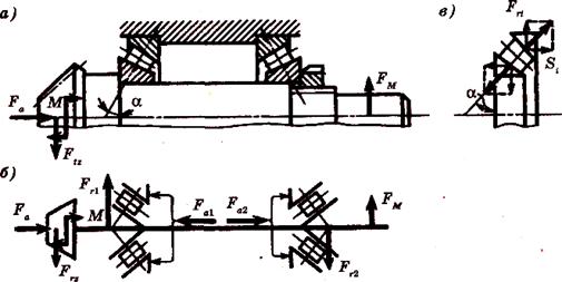 Fa2, поэтому для решения необходимо рассмотреть дополнительные условия. Наклон контактных линий в радиально-упорных подшипниках приводит к тому, что радиальные нагрузки Fr вызывают внутренние осевые силы S, которые стремятся раздвинуть кольца подшипника в осевом направлении (рис. 14.3, в).