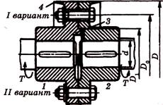 Болты, поставленные без зазора, могут обеспечивать центровку валов. При постановке болтов с зазором центровка обеспечивается выступом 3, который воспринимает также все поперечные нагрузки. Центрирующий выступ усложняет монтаж и демонтаж соединения, так как при этом необходимо осевое смещение валов. Для обеспечения техники безопасности выступающие части болтов закрывают буртиками 4 (I вариант). В тех случаях, когда муфта имеет общее ограждение, буртики не делают (II вариант). Расчет на прочность выполняют для шпоночных соединений и болтов (см. расчет призматических шпонок и расчет болтовых соединений нагруженных в плоскости стыка для болтов поставленных с зазором и без зазора). Установка болтов без зазора позволяет получить муфты меньших габаритов и поэтому применяется чаще. Фланцевые муфты применяют для соединения валов диаметром до 200 мм. Достоинствами таких муфт является простота конструкции и сравнительно небольшие габариты.