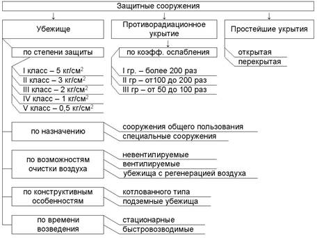 Защитные сооружения делят на убежища, противорадиационные укрытия, простейшие укрытия. Убежища и ПРУ обычно строятся заблаговременно по специальным строительным нормам и правилам "Инженерно-технические мероприятия гражданской обороны и предупреждения чрезвычайных ситуаций". При отсутствии ЧС они используются в хозяйственных целях (как склады, бытовые помещения, учебные классы, столовые, буфеты и т.п.). Однако всегда нужно предусматривать возможность быстрого перевода убежищ и ПРУ на использование по прямому назначению.