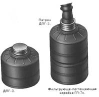В комплект входят: цилиндрической формы патрон ДПГ-3, соединительная трубка и вставка. При помощи соединительной трубки патрон прикрепляется к лицевой части противогаза. Для этого на нем имеется наружная навинтованная горловина, а в дне - внутренняя, что позволяет присоединять фильтрующе-поглощающие коробки ГП-7 или ГП-5. Внутри патрона установлен однослойный специальный поглотитель.